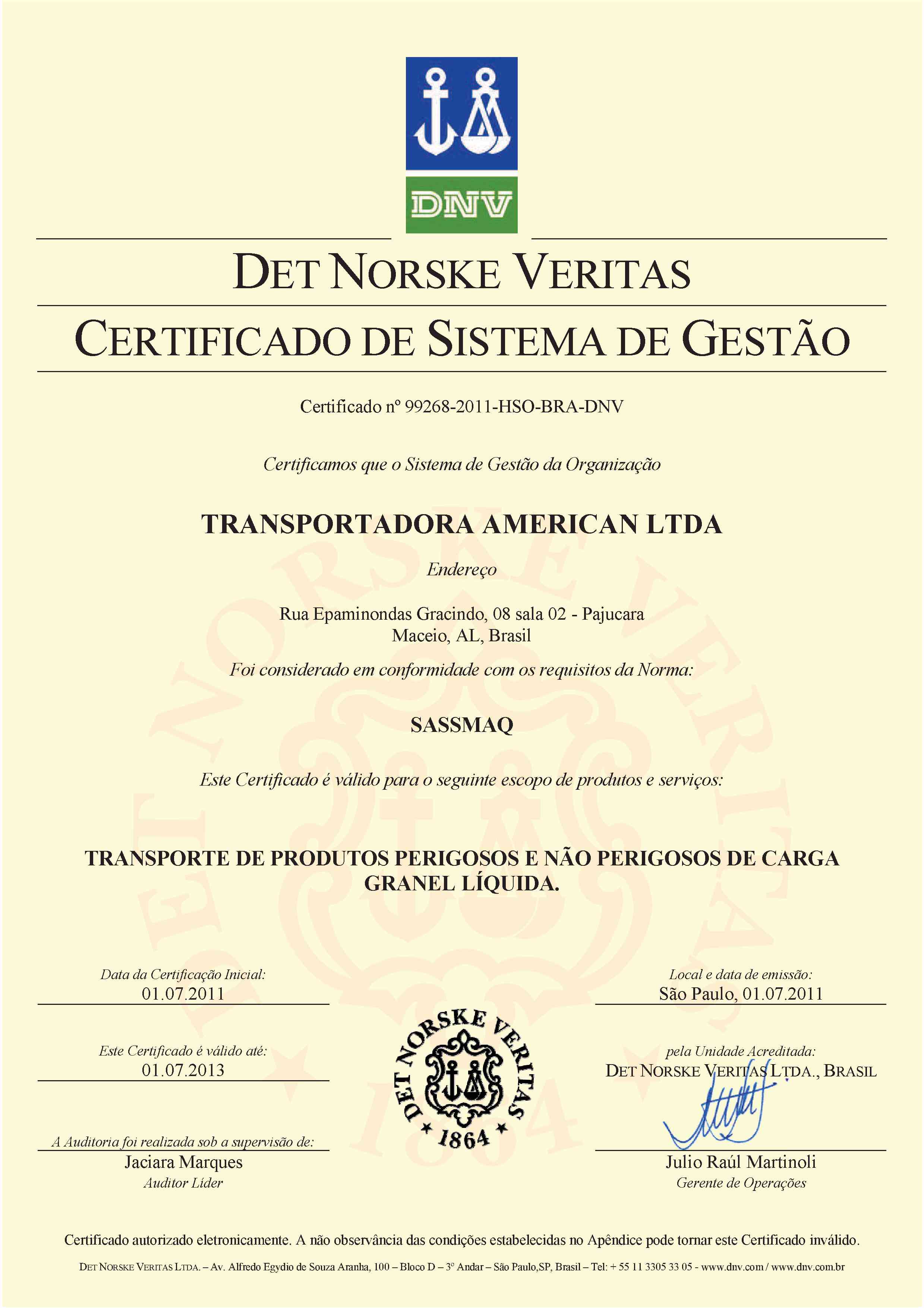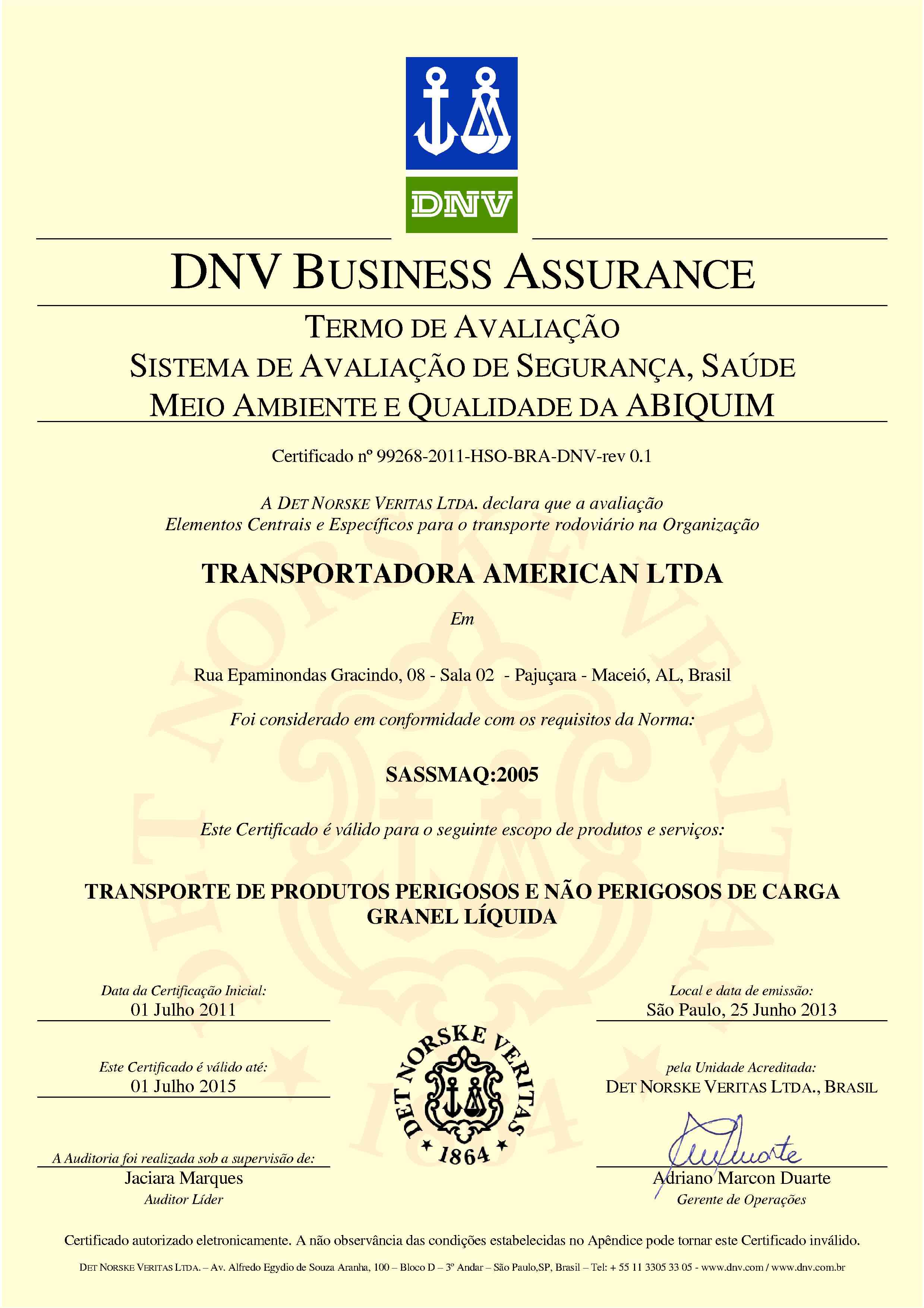 Desde nossa fundação, somos orientados para atendimento as normas do Sistema de Avaliação em Segurança, Saúde, Meio Ambiente e Qualidade – SASSMAQ da Associação Brasileira de Indústrias Químicas – Abiquim. O comprometimento com o sistema é verificado em auditorias realizadas por organismos internacionais de certificação como a DNV – Det Norske Veritas.